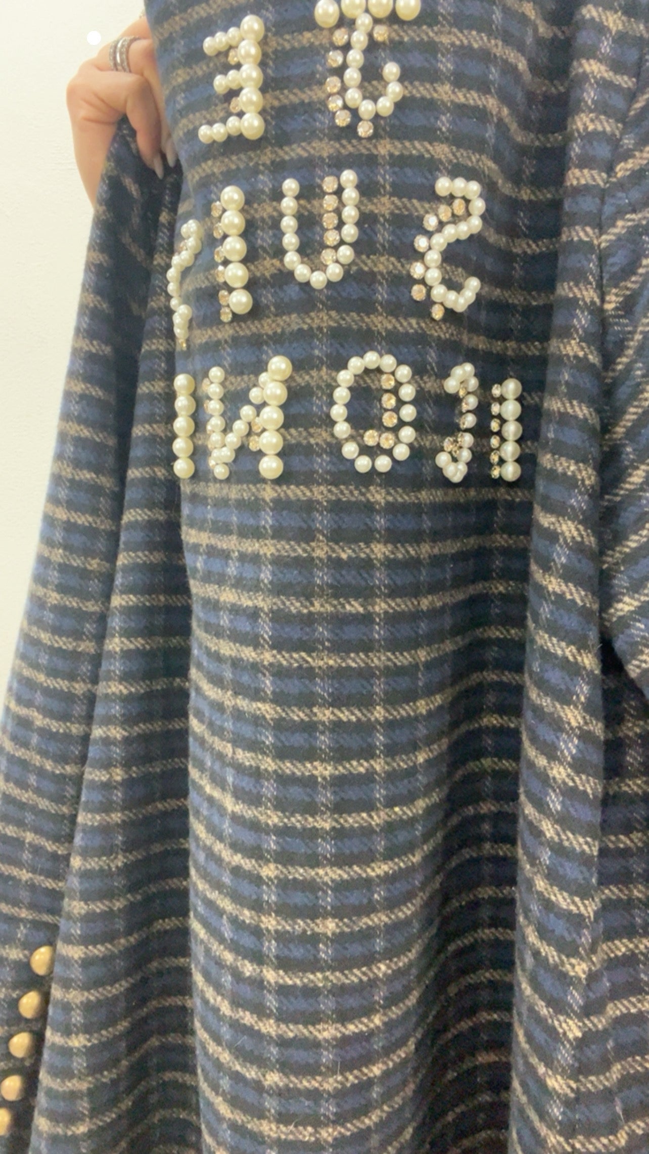 Cappotto con colletto,scritta con perle e strass.