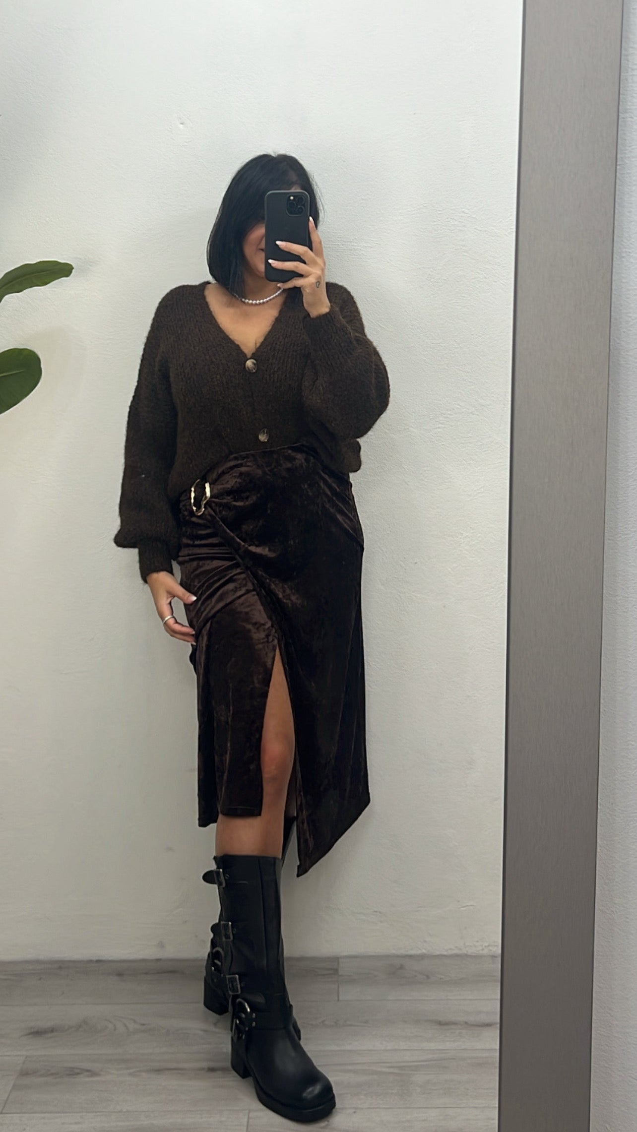 Gonna in ciniglia con spacco e accessorio in oro.Taglia unica veste 40/44