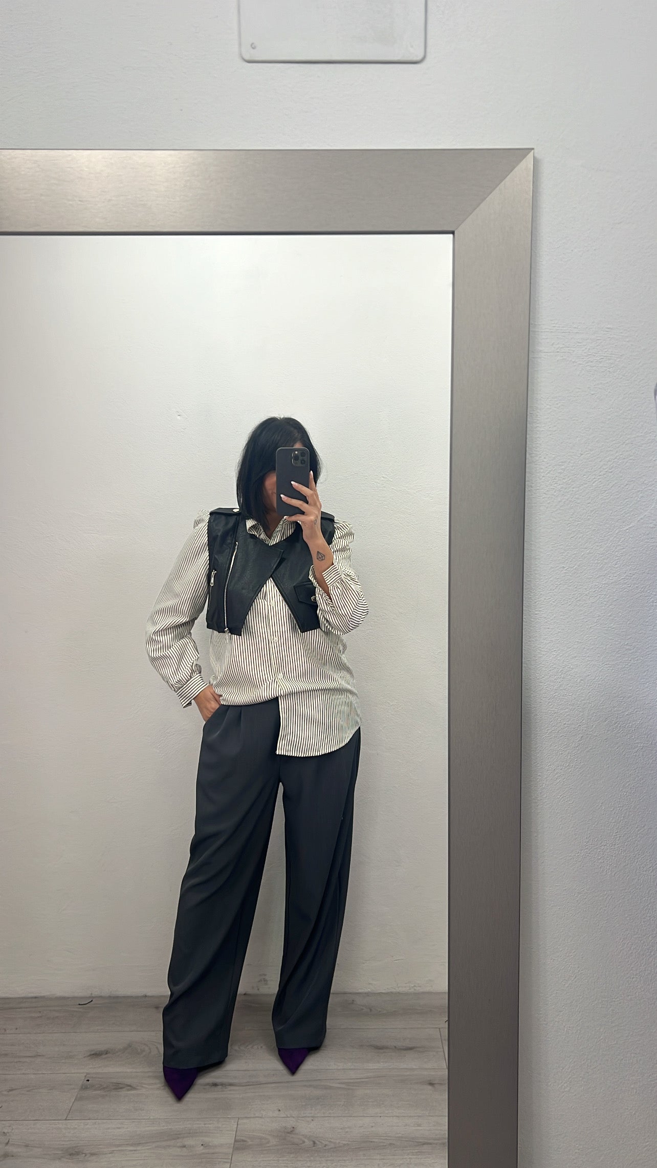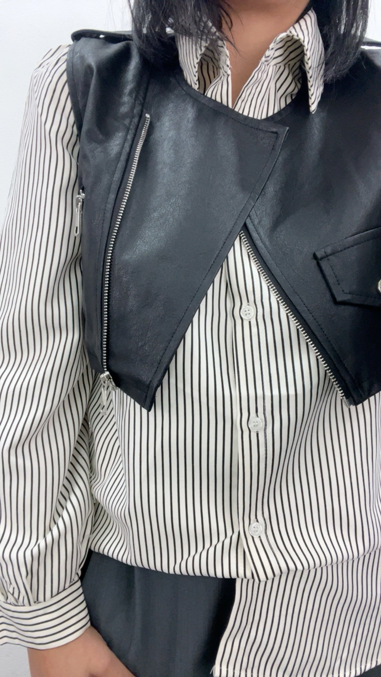 Camicia a righe con gilet ecopelle.Taglia unica veste 40/44