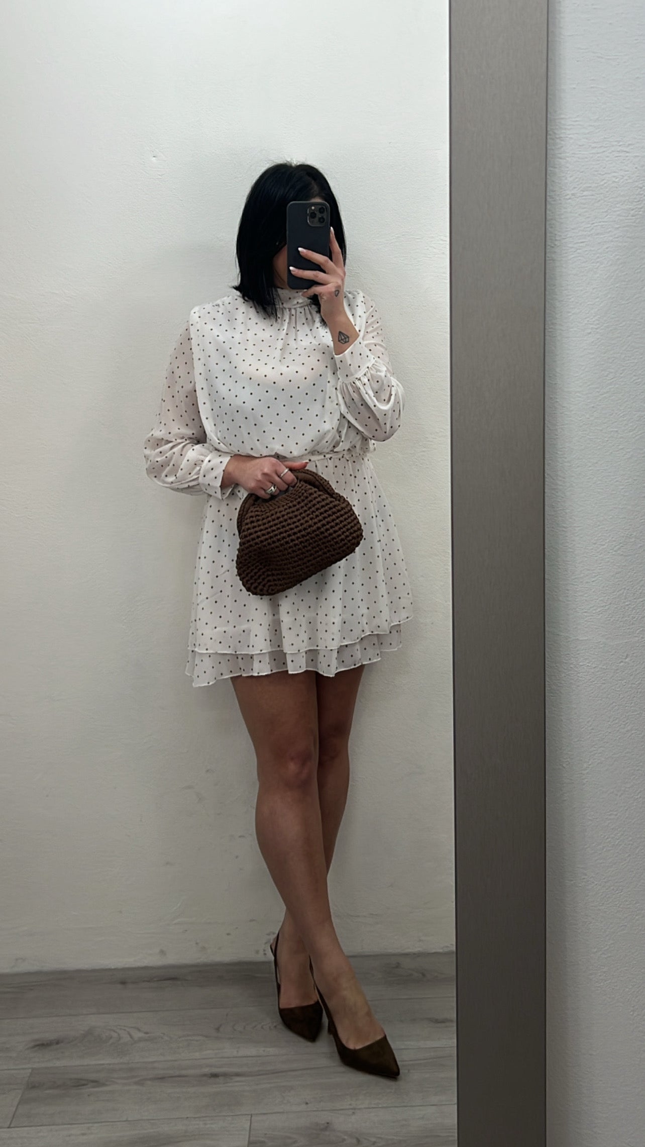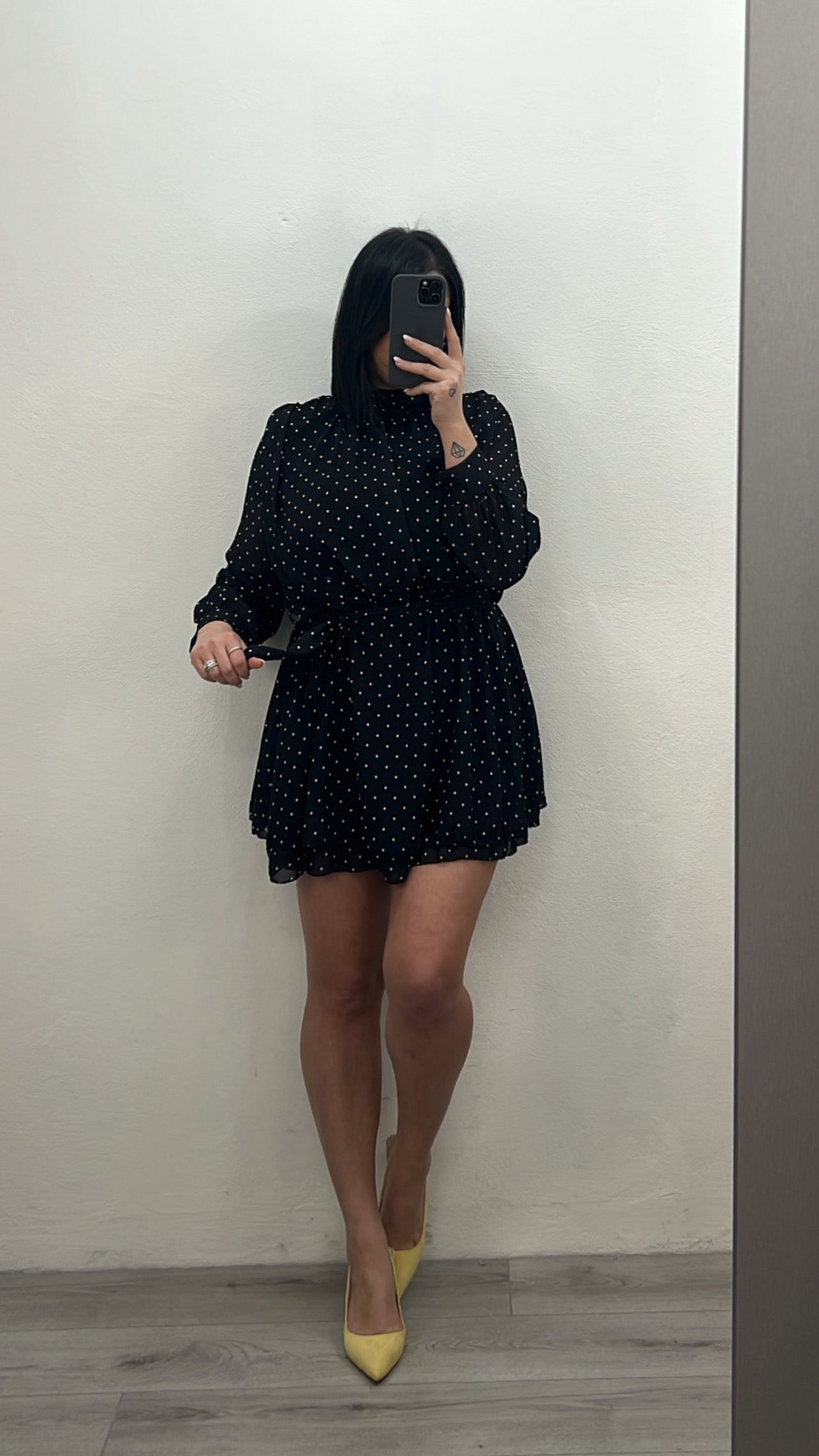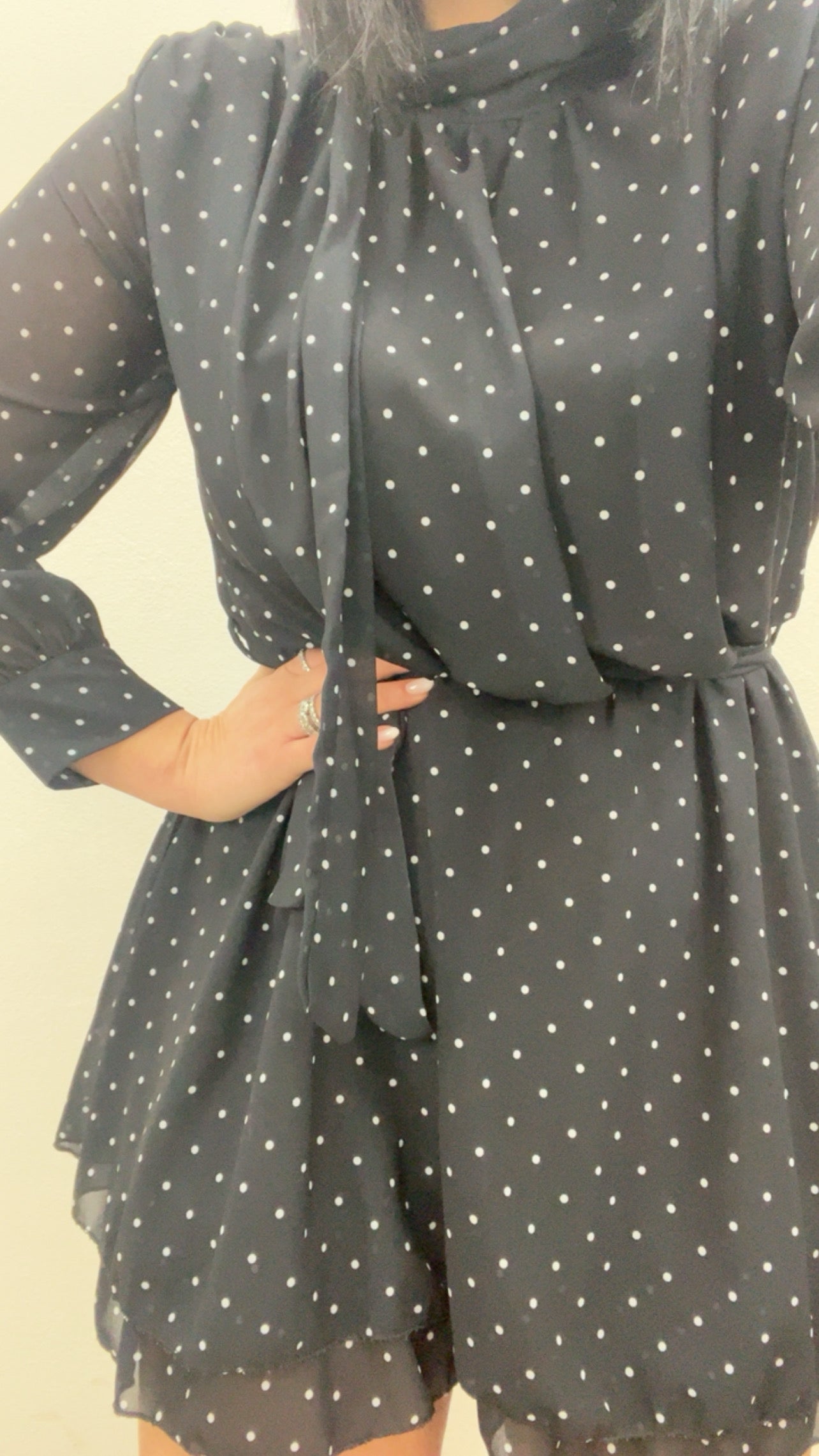 Abitino in tessuto leggero a pois.Taglia unica veste 40/44.Colletto con allacciatura al collo e cintura