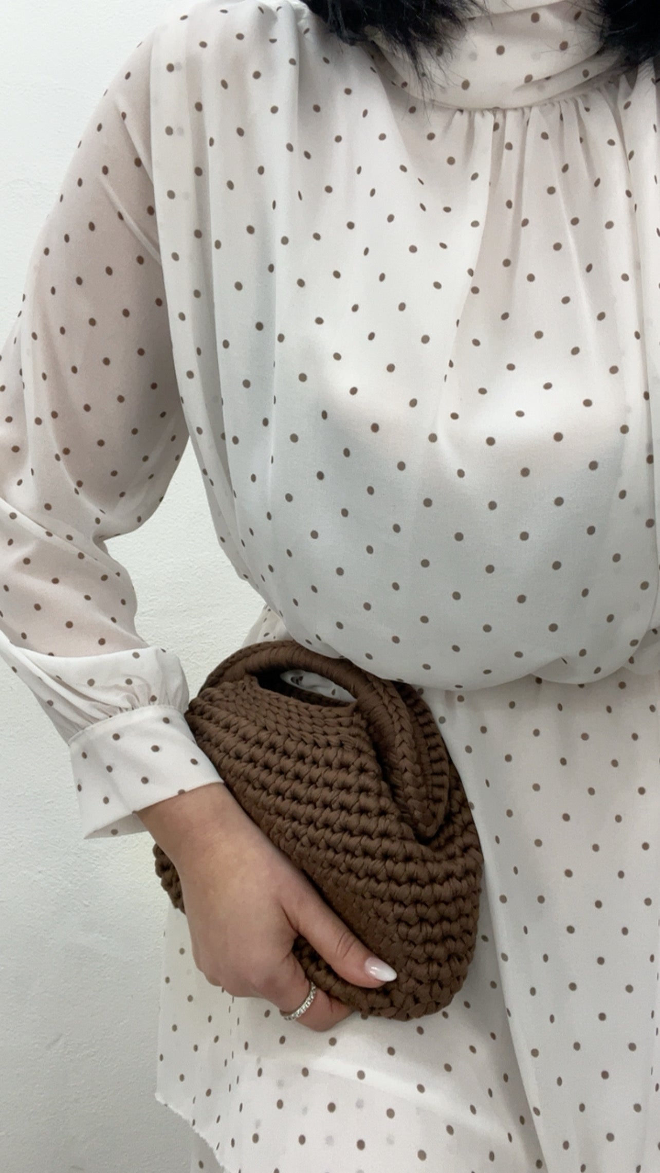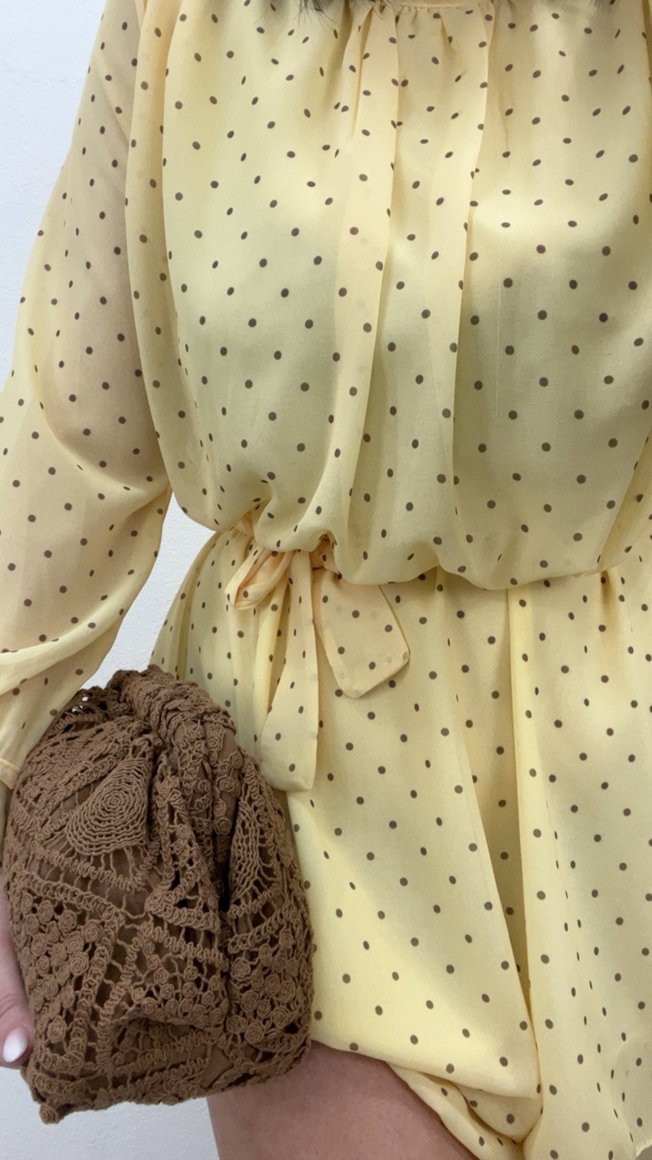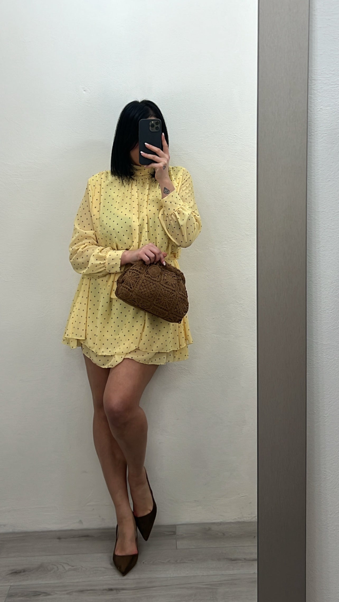 Abitino in tessuto leggero a pois.Taglia unica veste 40/44.Colletto con allacciatura al collo e cintura